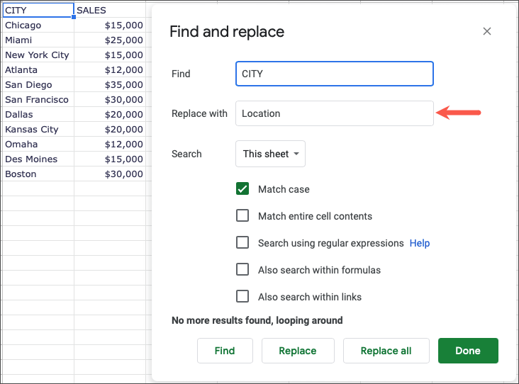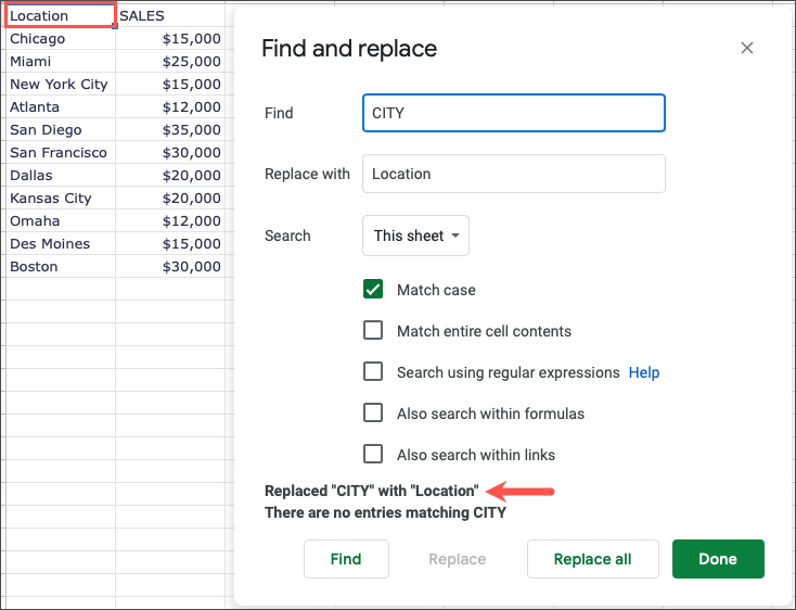 If you want to replace that data with something else, this is simple. Here, we want to replace “CITY” with “Location.” Enter the Find and Replace with terms, check Match case, and select Find.
