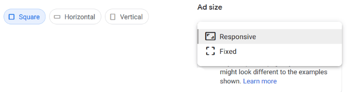- Choose from Square, Horizontal, or Vertical. Google recommends using Responsive ad size.