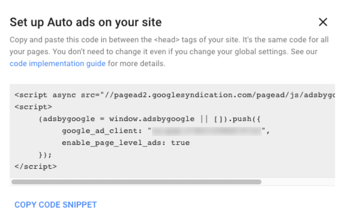 Click Get Code, copy it and put it on each of your web pages in between the **** tags. Google will automatically show ads in the best places for your site.