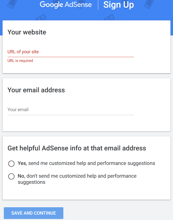 - Fill out the form by adding the URL of your site where you want the ads to appear. You need to be the owner of the website.