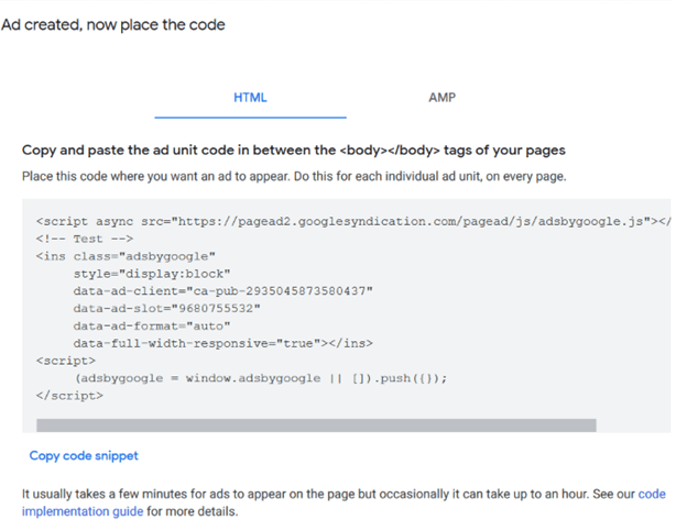 - Give your ad unit a name and click Create. AdSense will give you JavaScript code to insert on your web page where you want the ad to show.