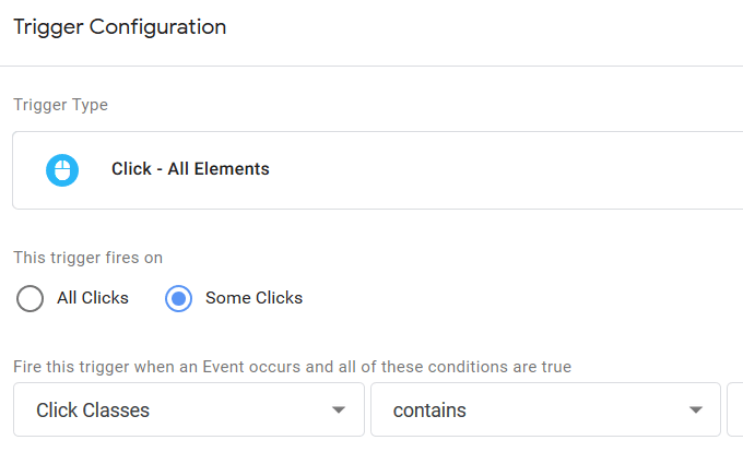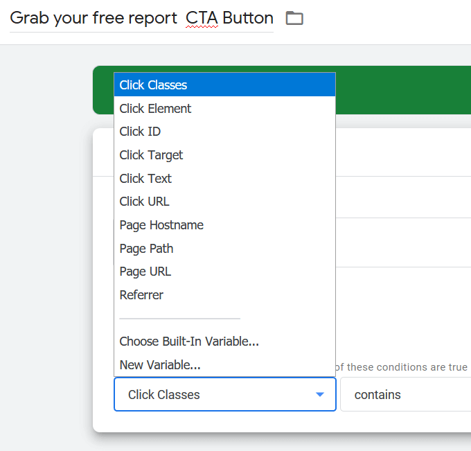 You will see click classes, click elements, and click texts. All the different clicks and click classes are notated. Once you have located the variables, figure out what to filter out for the button you want to track.