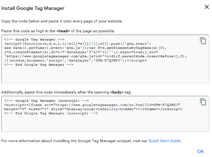 - After you agree to Google’s terms of service, you will see your container ID with two code snippets.