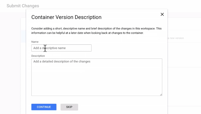 - In the Container Version Description section add a descriptive name for your event and click Continue.