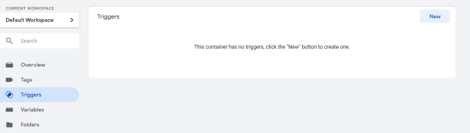 - The next step is to enable a trigger that will fire on all clicks. Click on Triggers from the navigation on the left and hit NEW.