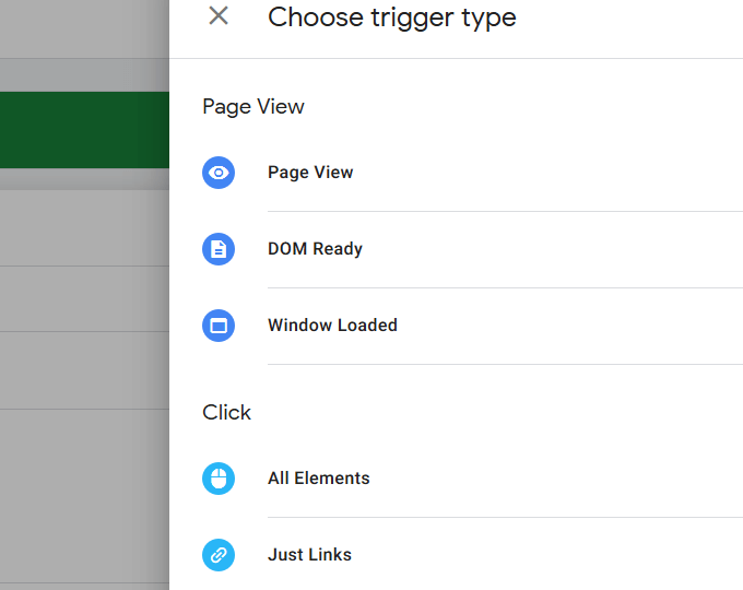- To select a trigger type, click inside the trigger window, scroll down to the bottom of the pop-up page, and click on All Elements.