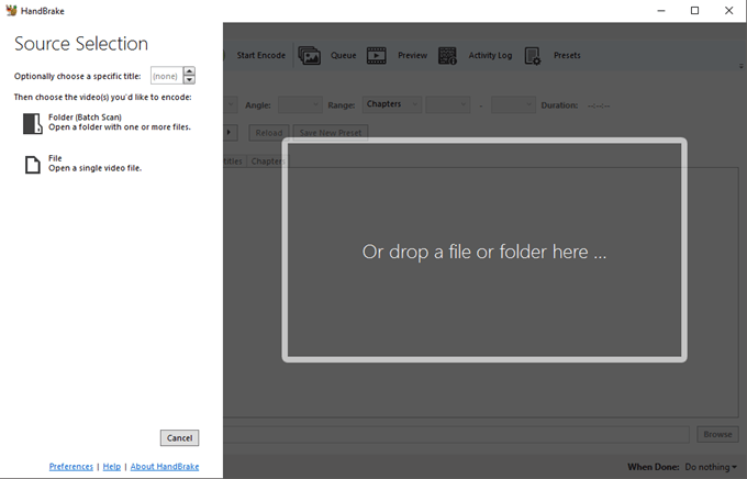 When you launch the program, you’ll be asked to open the file you want to convert. You can use the prompt in the sidebar or drag the file into Handbrake.