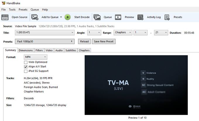 Handbrake’s main dashboard provides you with information about the video you’ve opened. You’ll find several tabs underneath the source information that provide customization options.