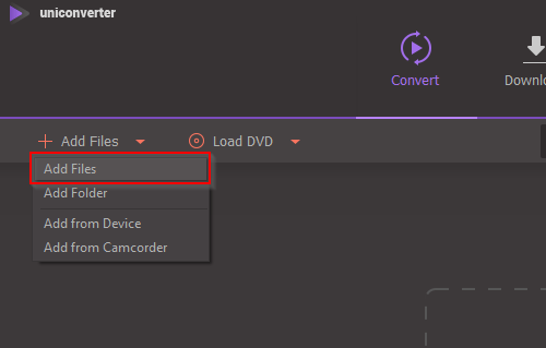 After installing, launch UniConverter. You will then be prompted to add the file you want to convert. Click Add Files to open the video.