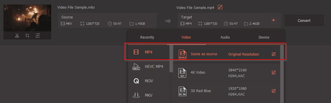 However, if you only need to convert the MKV file as is, then open the Summary tab and select MP4 under Format.