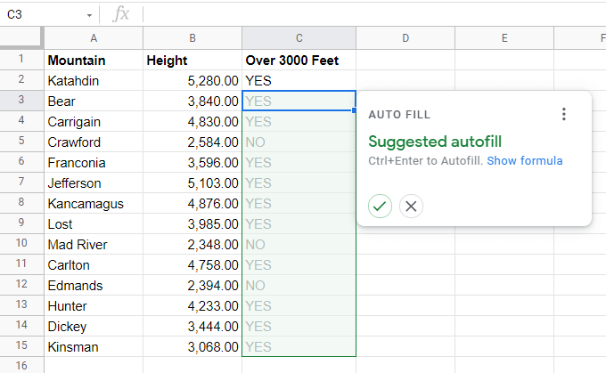 You may also see a Google Sheets suggestion to autofill the rest of the cells below this one. Select the checkmark if you’d like to go ahead and autofill the rest of the cells with this same function. The references will automatically update to the correct cells for those mountain heights.