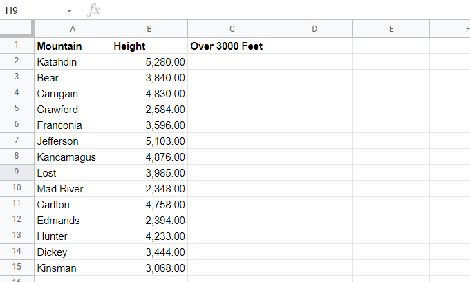 You’re only interested in hiking mountains that are higher than 3000 feet in altitude. So you create another column called “Over 3000 Feet”. An IF statement is the easiest way to fill out this field.