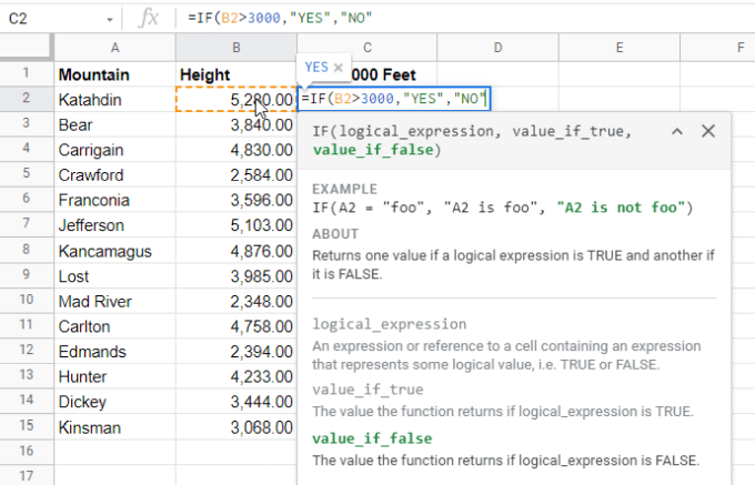 This IF statement means if the height of the mountain in cell B2 is greater than 3000, then display YES in cell C2, otherwise display NO.