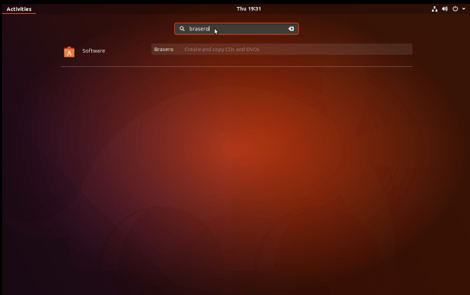 To install the ISO image burning software, click on Activities in the top left-hand corner of your Ubuntu desktop. Type brasero into the search box.