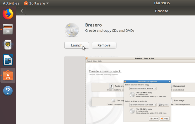 Enter your root password when prompted and allow the installation to finish. Once complete, click the launch button to start Brasero.