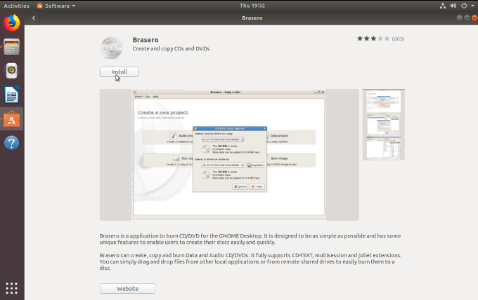 Next, you will see and click on the main listing in the Brasero summary. Then click install.