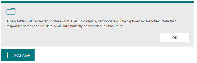 File Upload. This question type is only available to users who have a OneDrive for Business account. Choosing this question type will cause a new folder to be created in your oneDrive for Business, and respondents will upload their files to that folder.
