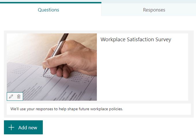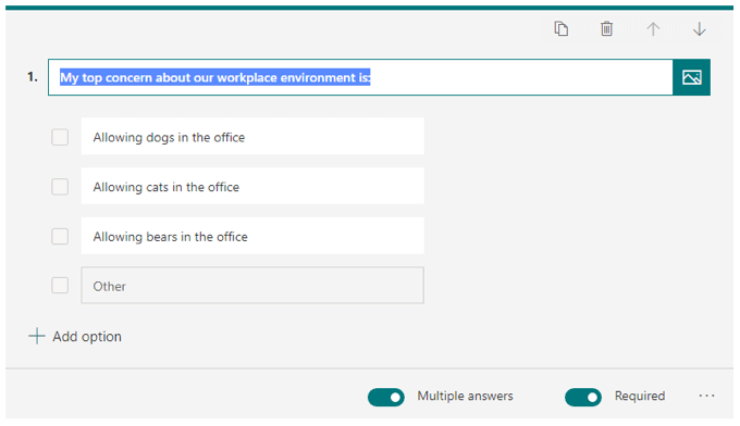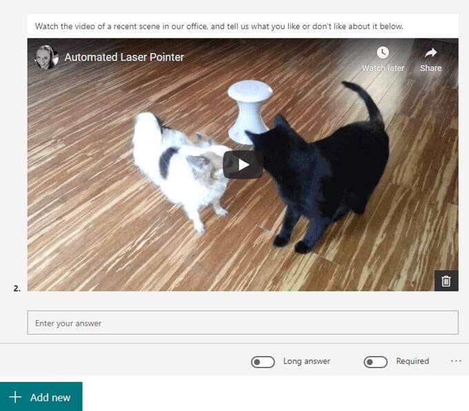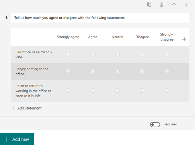 Select the Add new button and choose a question type. Microsoft Forms offers a variety of question types. Note: You can copy, delete, move, add a subtitle, or require a response to any question.