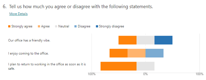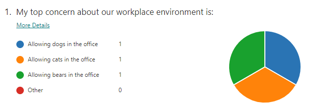 Select the View results button to click through each individual response. Alternatively, select Open in Excel to export the form responses to a spreadsheet. The Responses dashboard also summarizes responses to each question, often displaying results in a chart.