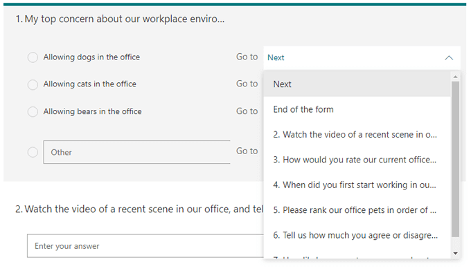 Microsoft Forms also lets you apply question logic (they call it “branching”). Click the more options icon and select Add branching. Navigate to the question to which you want to apply branching, and for each possible answer, you can specify which question the respondent will be directed to next.