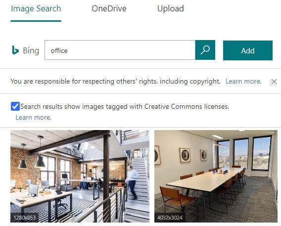 If you choose the third option, you can either search Bing for an image or upload your own image from from your OneDrive account or your computer. You can also choose to restrict image search results to only those tagged with Creative Commons license, which is really handy. Click the Add button to set the image you have chosen as the background image for your form.