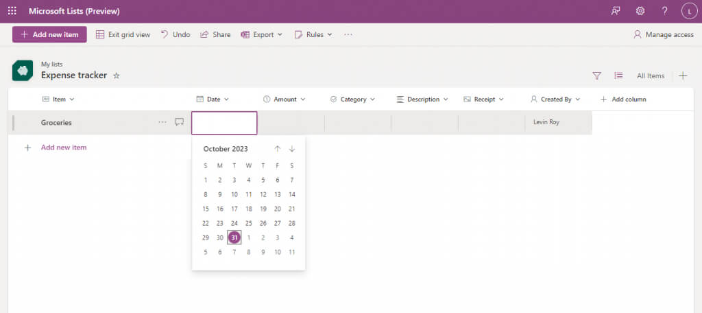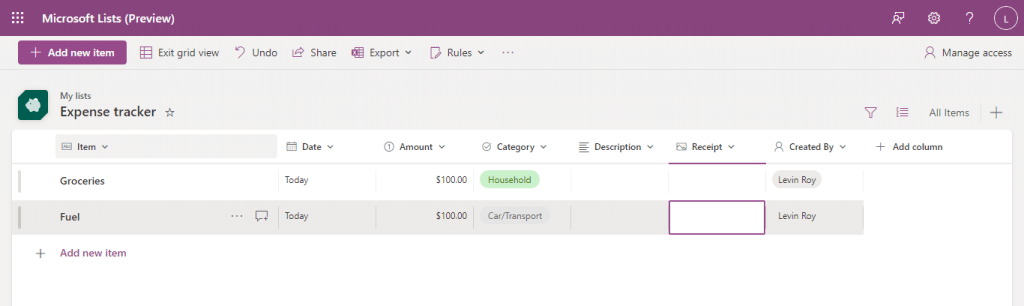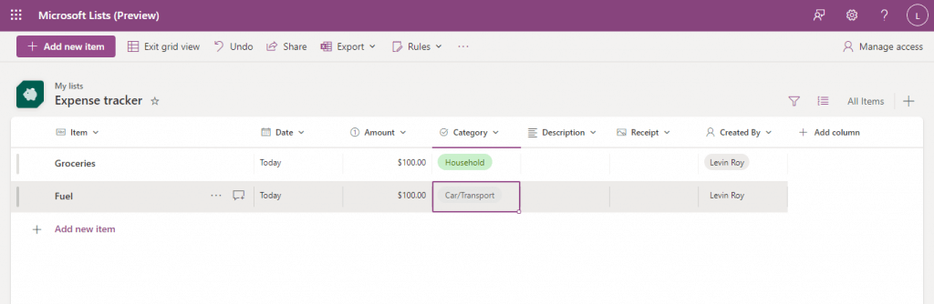 - Simply enter all the fields to create a new item, repeating the process for as many entries as you want to add. As you might note, the Created by field keeps track of who added the item, making it easier to organize in case of multiple people using the same list.