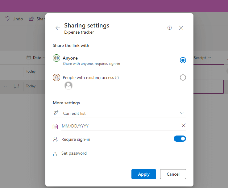 - Now you can change the sharing access, from turning off the sign-in requirement to restricting it to people added to your organization. You can also set a password for an extra layer of security, or change what kind of permissions the link provides, limiting it to viewing only if you need to. Select Apply when you are done to bring the changes into effect.