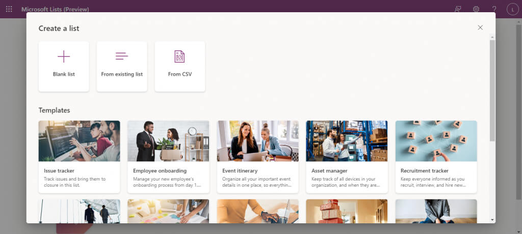 - This is where we get our first glimpse of the flexibility of Microsoft Lists. You can create a Blank list, use ready-made templates, or import a .csv file as a list, similar to Microsoft Sharepoint. And of course, you can also select a template to create a specific type of list.