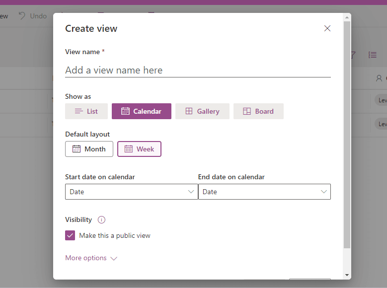 - Here you can select the type of the list and enter the additional information required. Gallery and the default List view only require a name, while the Board needs you to specify a column to organize the list by. The Calendar view asks for a layout (Month or Week) along with the starting and ending dates.