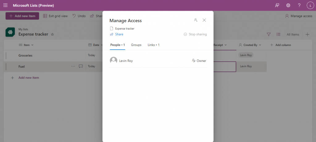 Don’t worry about any mistakes made during this part; you can always use the Manage access button on the top right to modify user permissions for any given list.