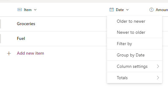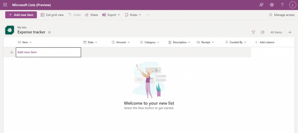 - The new list will open with all the fields (columns) already in place, ready to accept data. You can add more fields with the Add column button on the right, and new rows with the Add new item option on the left.