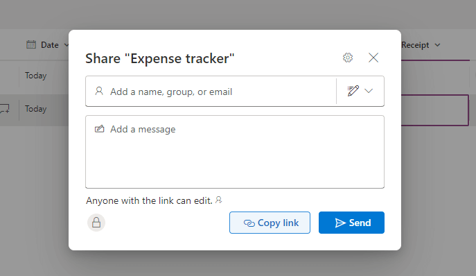 - A small window will appear, letting you add names and a message for the people you are sharing the list with. All of it is optional since the only thing you need to do is to Copy link and share it with your team members.