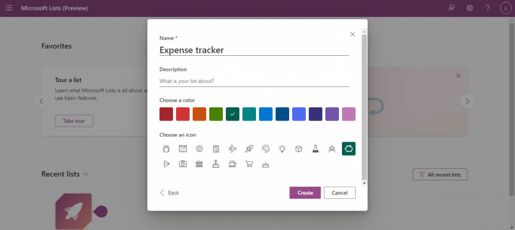 - Now just enter a name for the list, along with an optional description to make it easier to understand the purpose of the list. A color and icon will be chosen by default (based on the type of template) but you can change these too if you want. Select Create when you are satisfied.