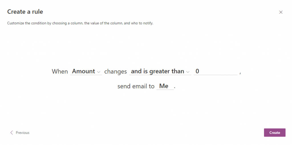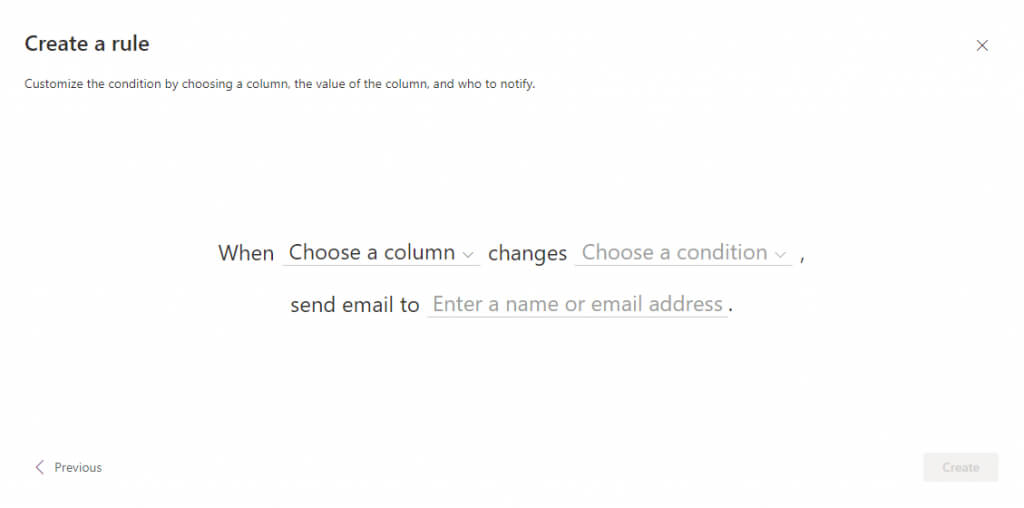- Enter any other information required (such as the name of the column to track and any additional conditions) and the name or email address of the person to be notified.