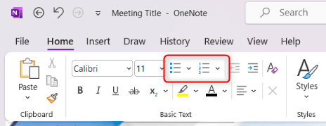 Creating bulleted or numbered lists in OneNote is easy. Click the desired location on a Page and then select either the Bullets or Numbering icon from the Home tab in the Ribbon.