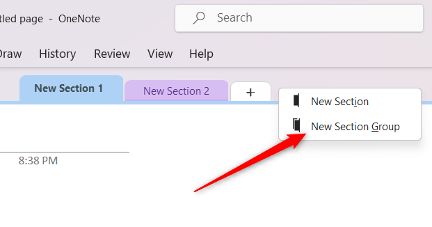 - Right-click the space in the Section tabs area and select New Section Group from the context menu.