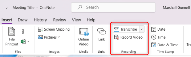 To create a recording, click the Insert tab in the Ribbon and select Record Audio or Record Video. Note that the Record Audio option is nested under the Transcribe option.