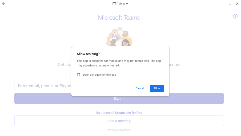 You may get a warning that Microsoft Teams is designed for mobile and may not resize well. Select Allow to proceed.