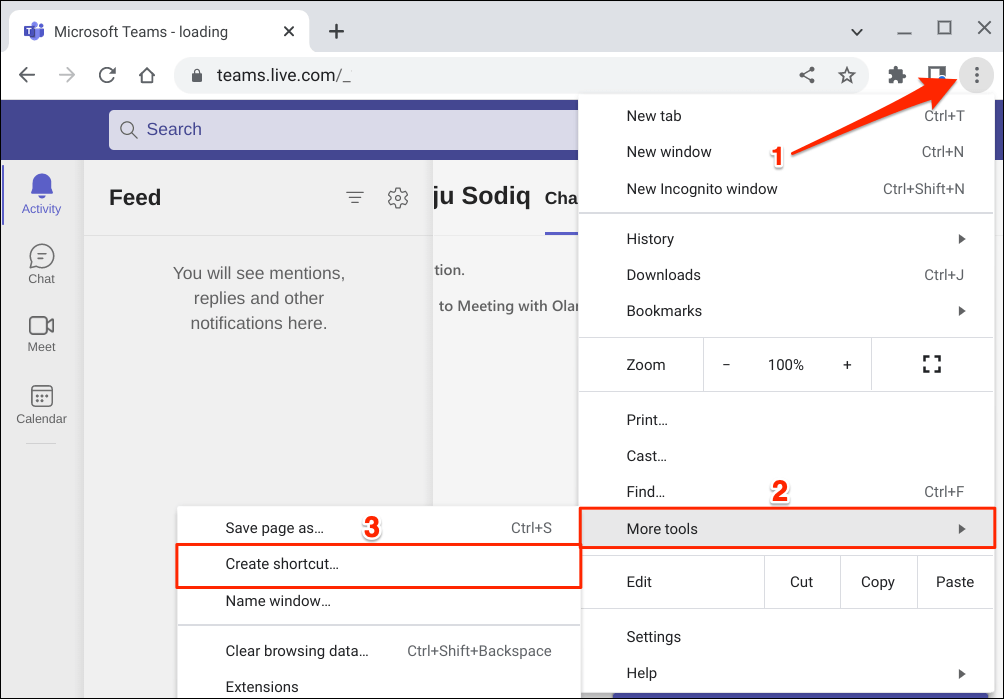 - Select the three-dot icon in the right-hand corner of Chrome’s window. Next, select More tools and select Create shortcut.