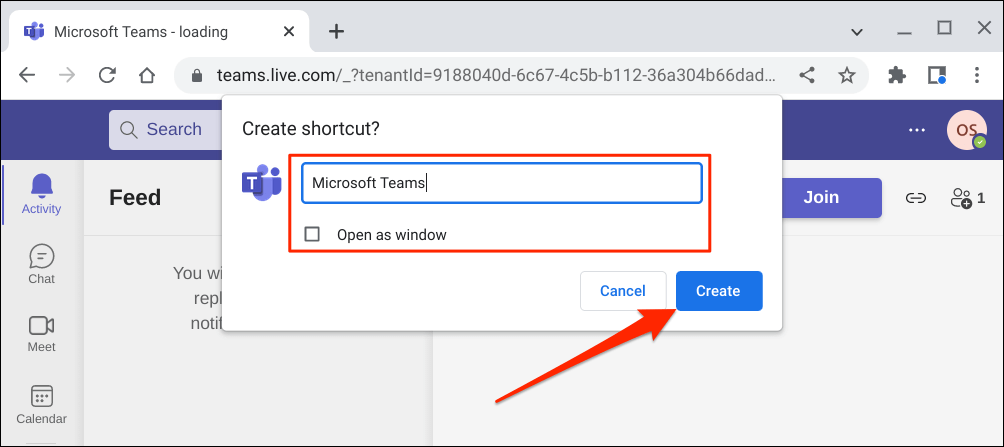 - Enter a name for the shortcut in the dialog box and select the Create button. Check the Open as window box if you want Microsoft Teams to launch in a new Chrome window when you open the shortcut.