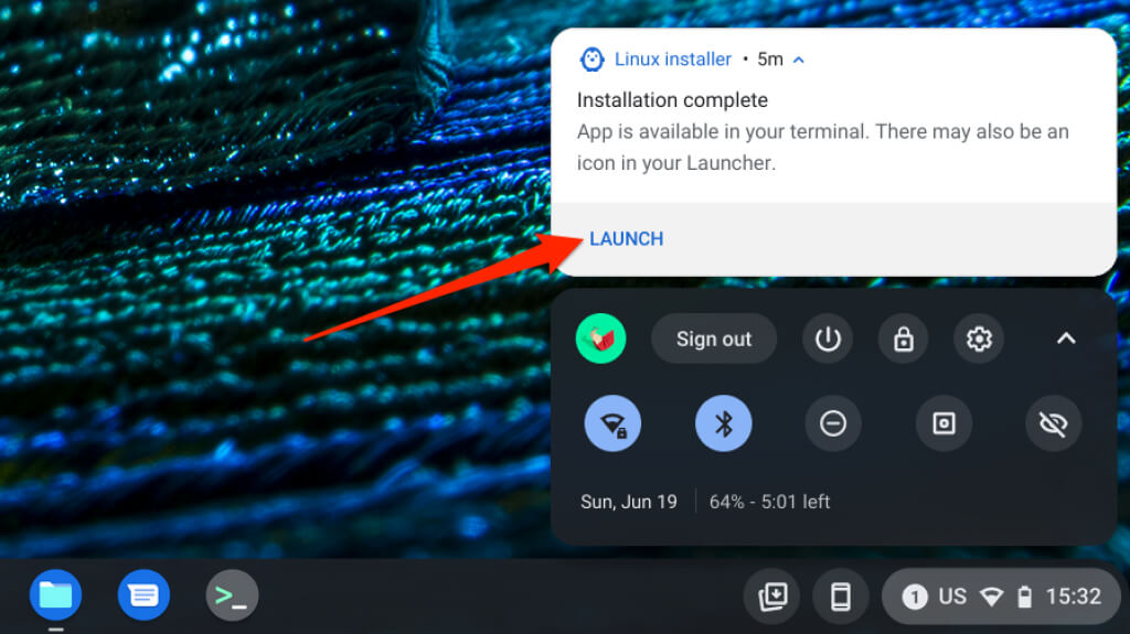 Look for an “Installation complete” notification in your Chromebook’s Status Area. Select Launch on the notification card to immediately open Microsoft Teams.