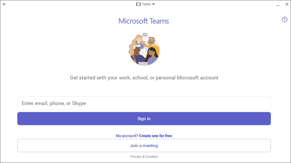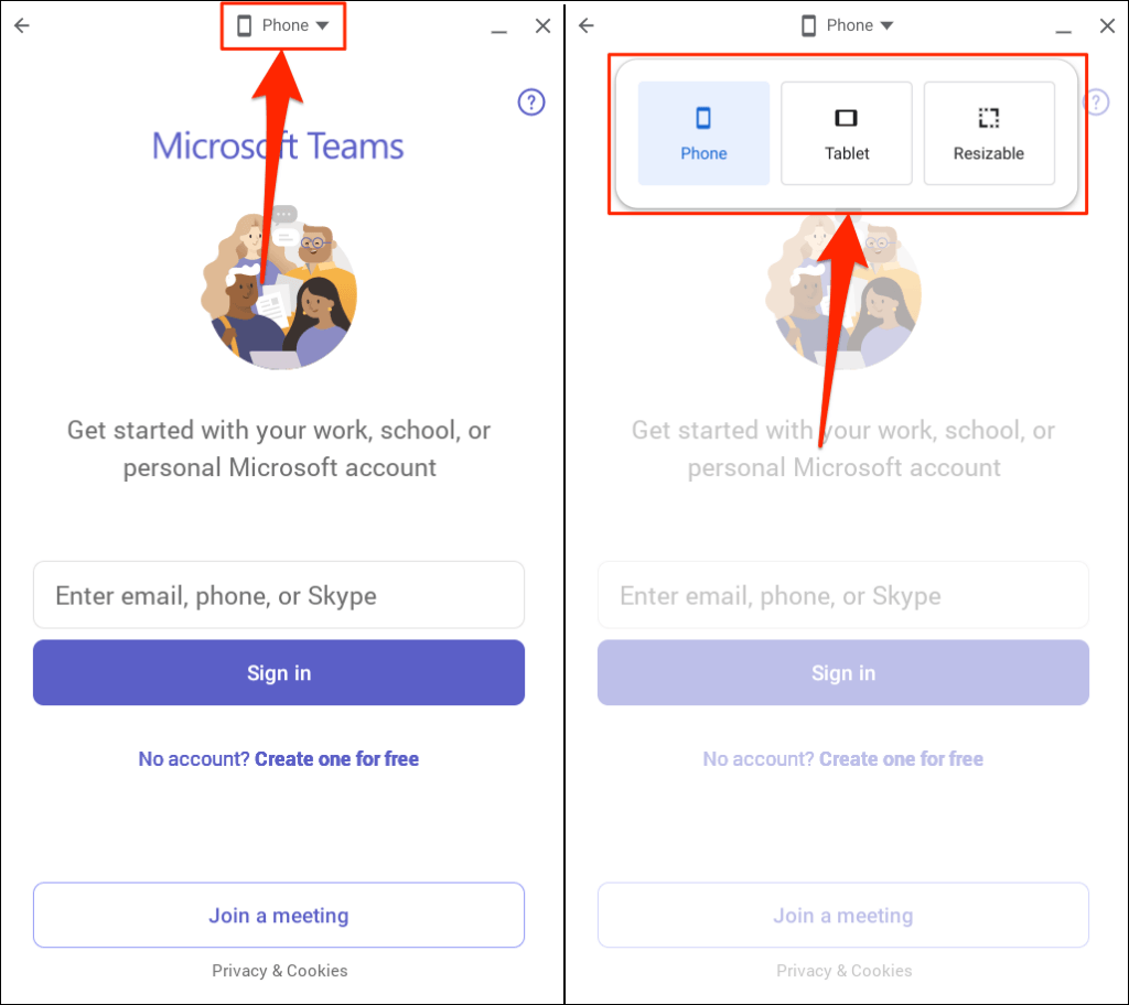 - Chrome OS may launch Microsoft Teams in “Mobile” mode or portrait orientation. For a desktop-like experience, tap the “Phone” drop-down menu on the title bar and select either Tablet or Resizable.
