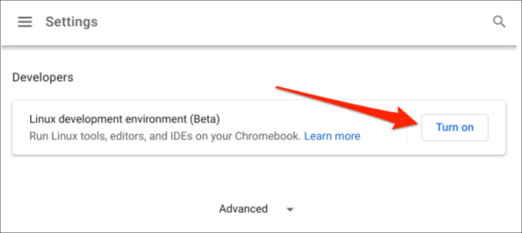 - Go to Settings > Advanced > Developers, select Turn on the “Linux development environment (Beta).” Select Next to proceed with the installation.