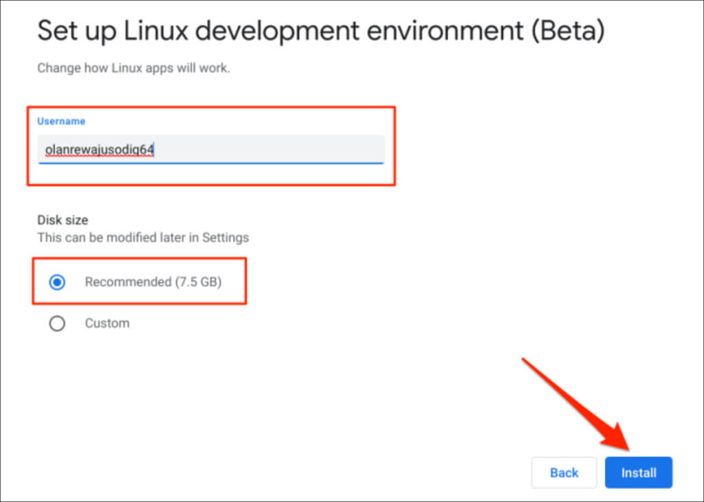 - Enter a username for the environment, select the recommended disk size, and select Install.