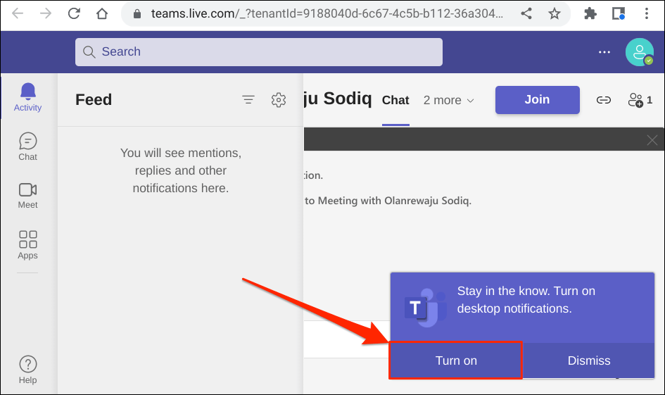 - Sign in with your Microsoft account details and select Turn on to allow Chrome to send you Microsoft Teams notifications.