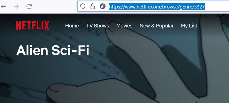 - In the URL field in your browser, at the end of the site address **https://www.netflix.com/browse**, type **/genre/(code here)**.
