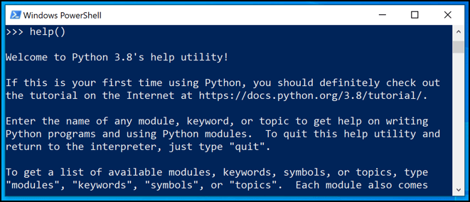 - If you’re unsure about anything while you’re using the Python interpreter, type help() to load the help utility. You can find a list of available Python modules by typing modules, topics by typing topics, keywords by typing keywords, and symbols by typing symbols. Once you’re finished, type quit to exit the help utility and return to the interpreter.