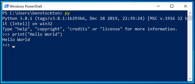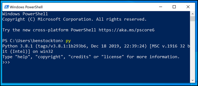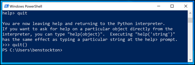 - To exit the Python interpreter and return to a standard PowerShell window, type exit() and press enter.