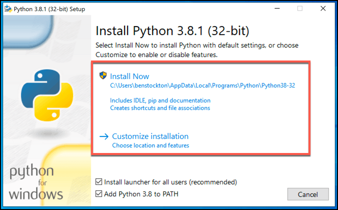 - When you’re ready to begin installing Python on Windows, click the Install Now option to install Python using the default settings, or Customize Installation to make changes before the installation begins.