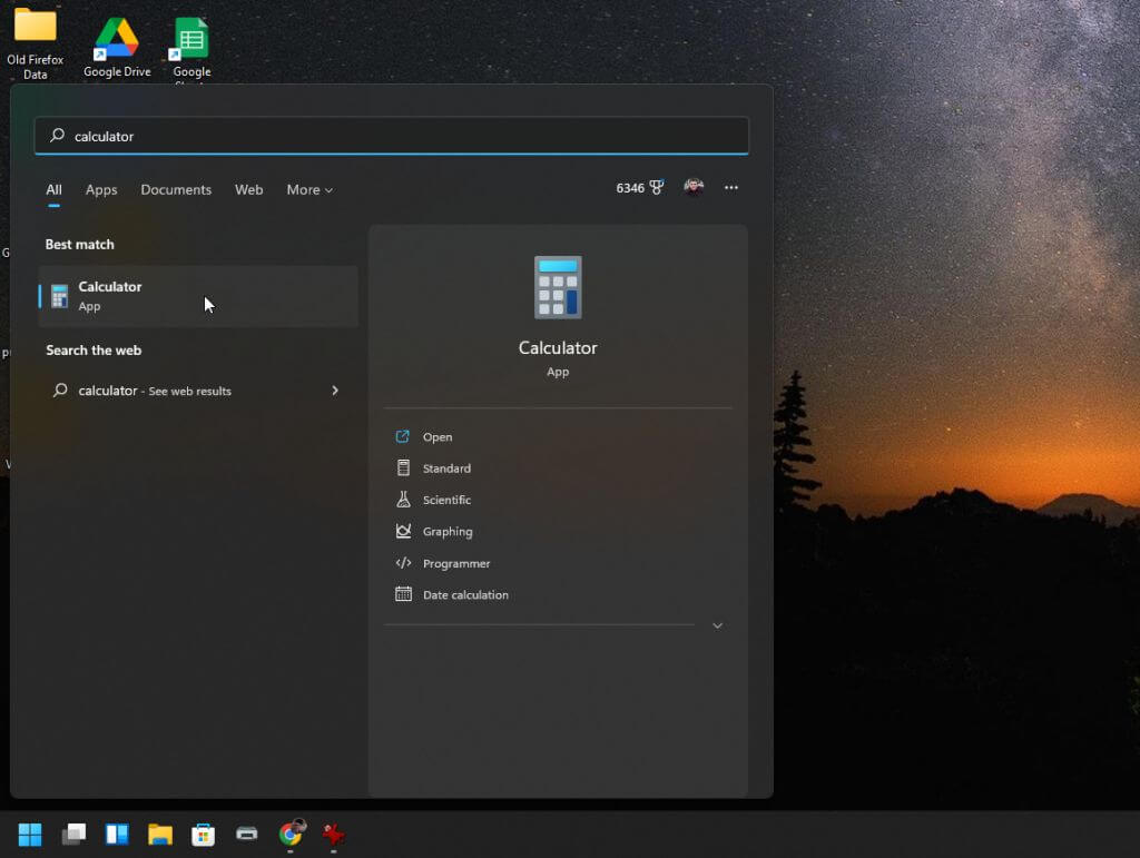 To open the graphing calculator, click the Start menu and type “calculator” in the search field. Then, select the Calculator app.